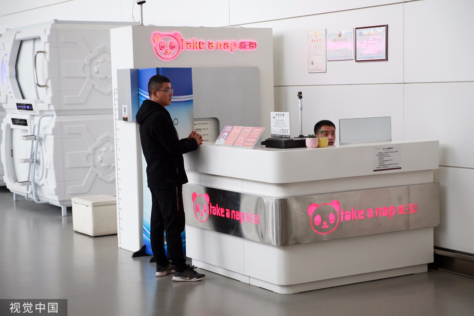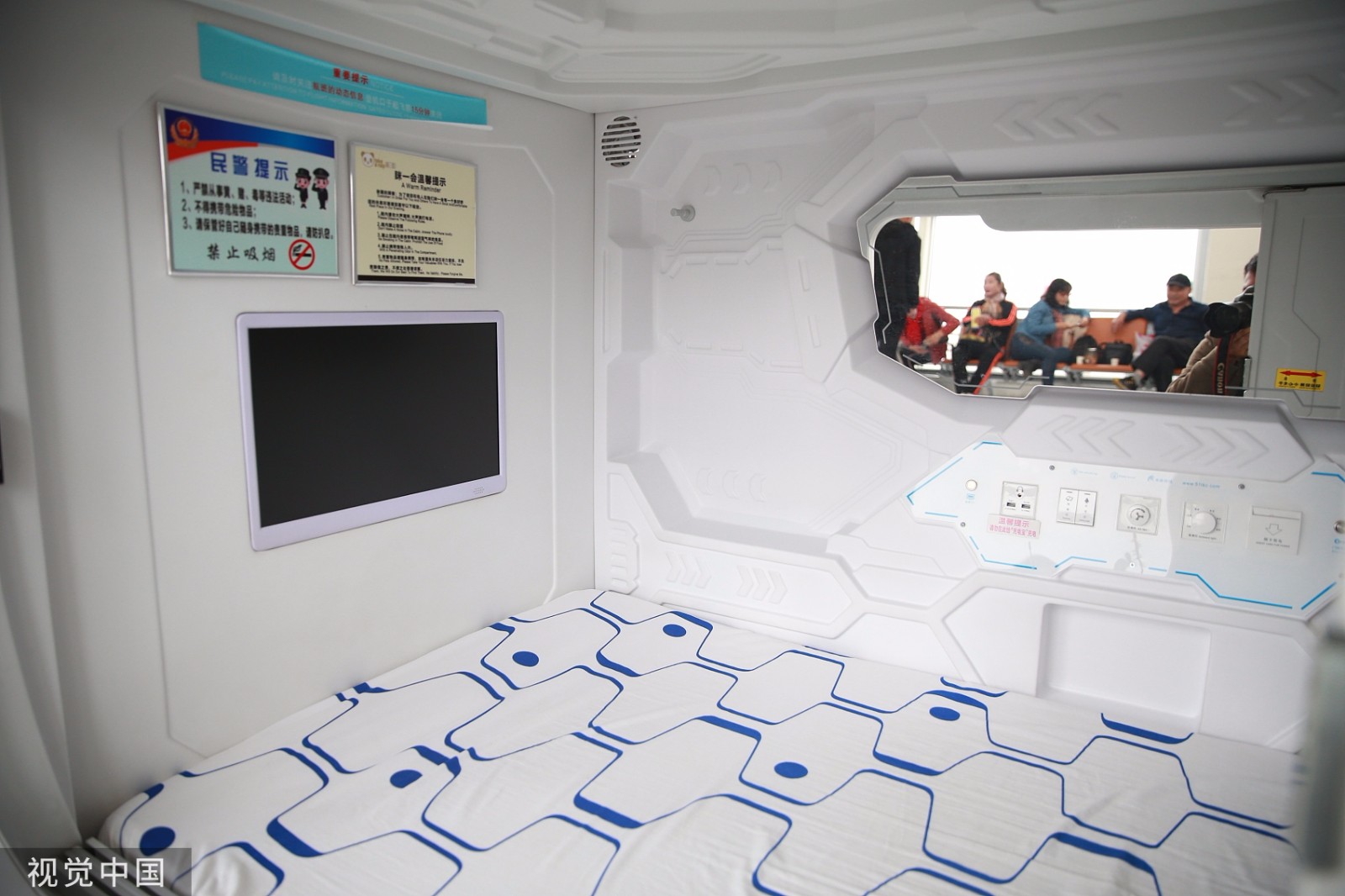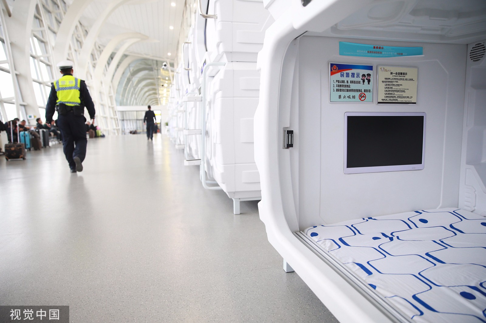 2019年10月23日,银川河东国际机场候机楼“胶囊”酒店内部场景。