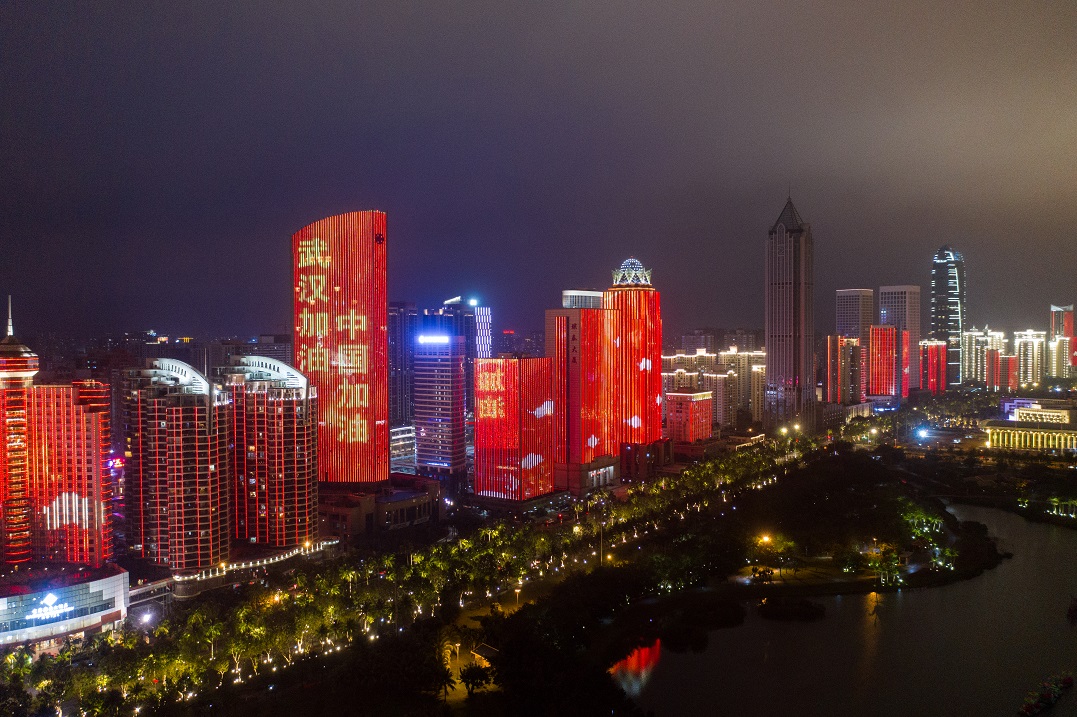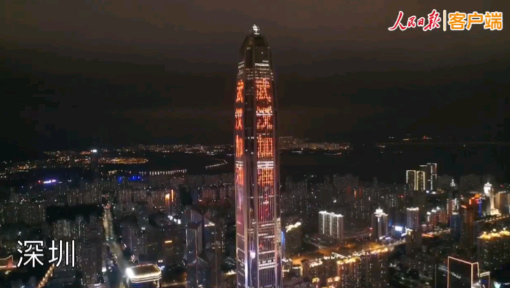 元宵战疫,团圆有时!今晚,元宵夜,全国多地地标亮灯,为武汉加油。图为深圳夜景。