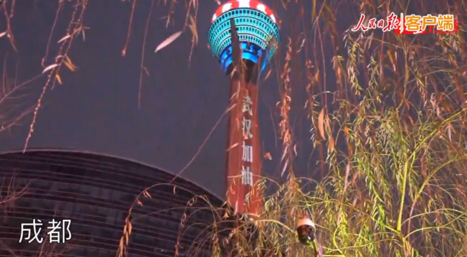 元宵战疫,团圆有时!今晚,元宵夜,全国多地地标亮灯,为武汉加油。图为成都夜景。