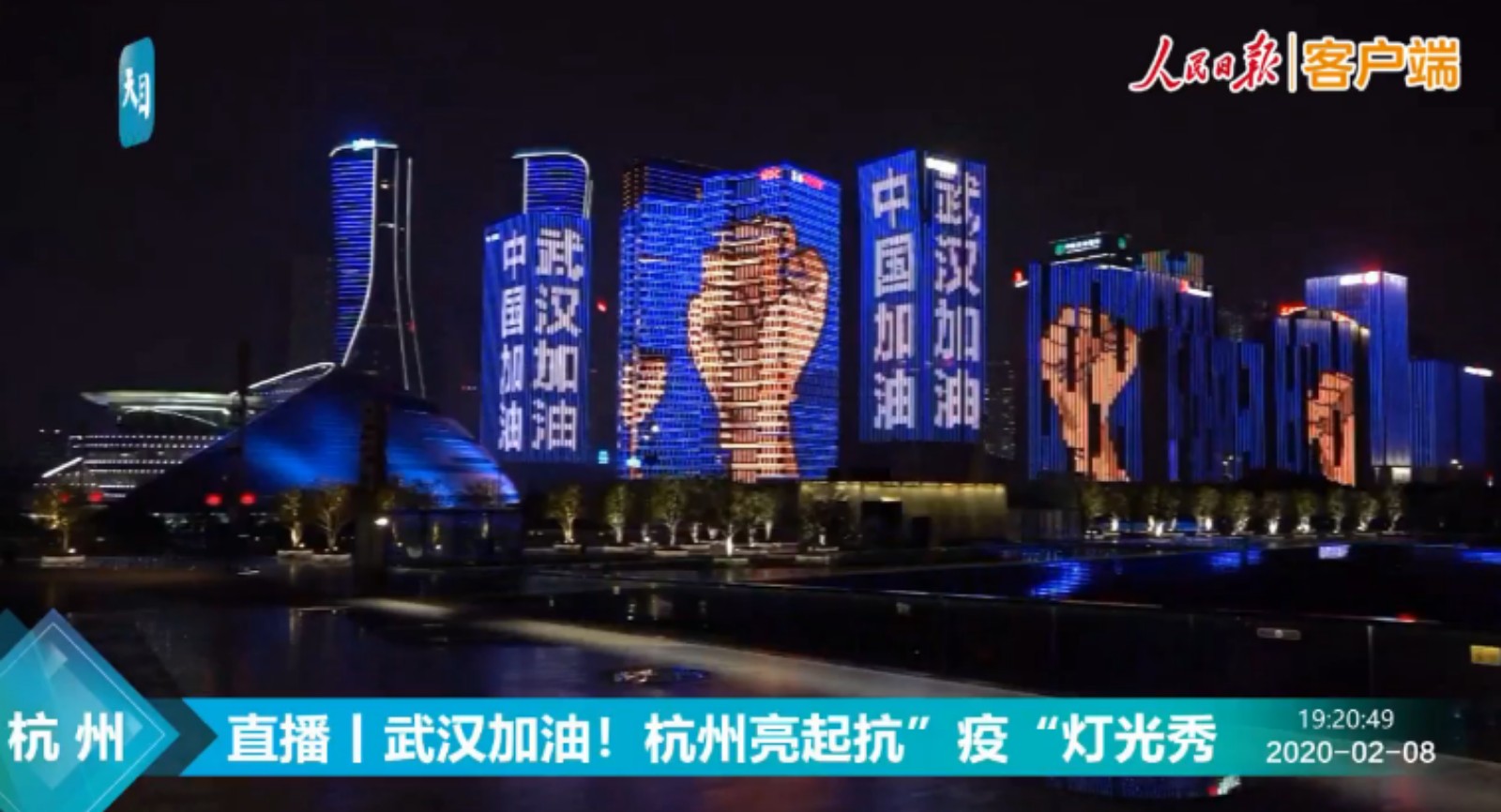 元宵战疫,团圆有时!今晚,元宵夜,全国多地地标亮灯,为武汉加油。图为杭州夜景。