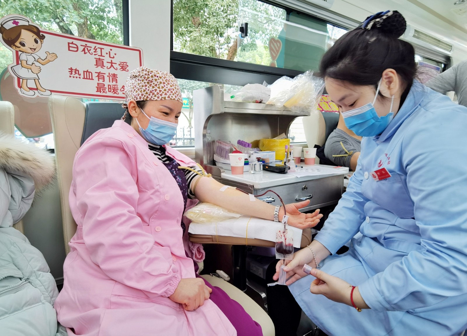 福建省南平市第二医院护士林美琼正在采血车上献血。