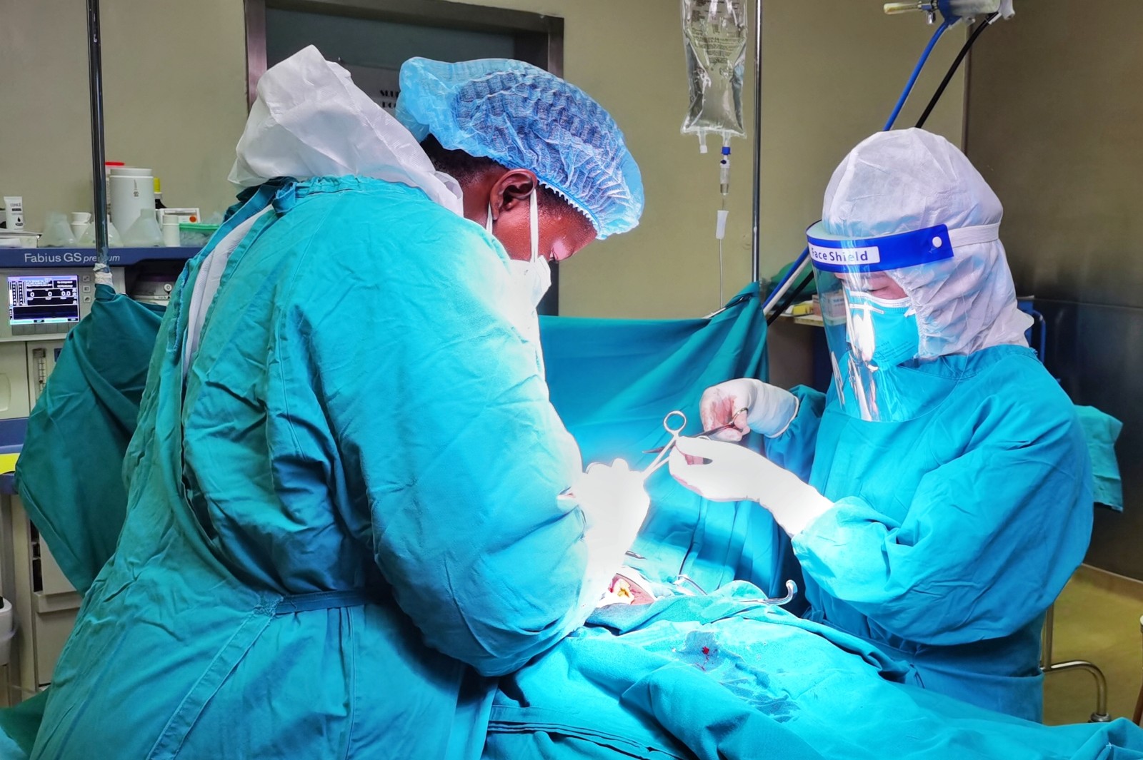 中午12点52分,在博茨瓦纳的公主玛丽娜医院手术室里,中国(福建)第16批援博茨瓦纳医疗队队员江双凤护士(右一)正在配合当地医生为一名急诊患者做手术。