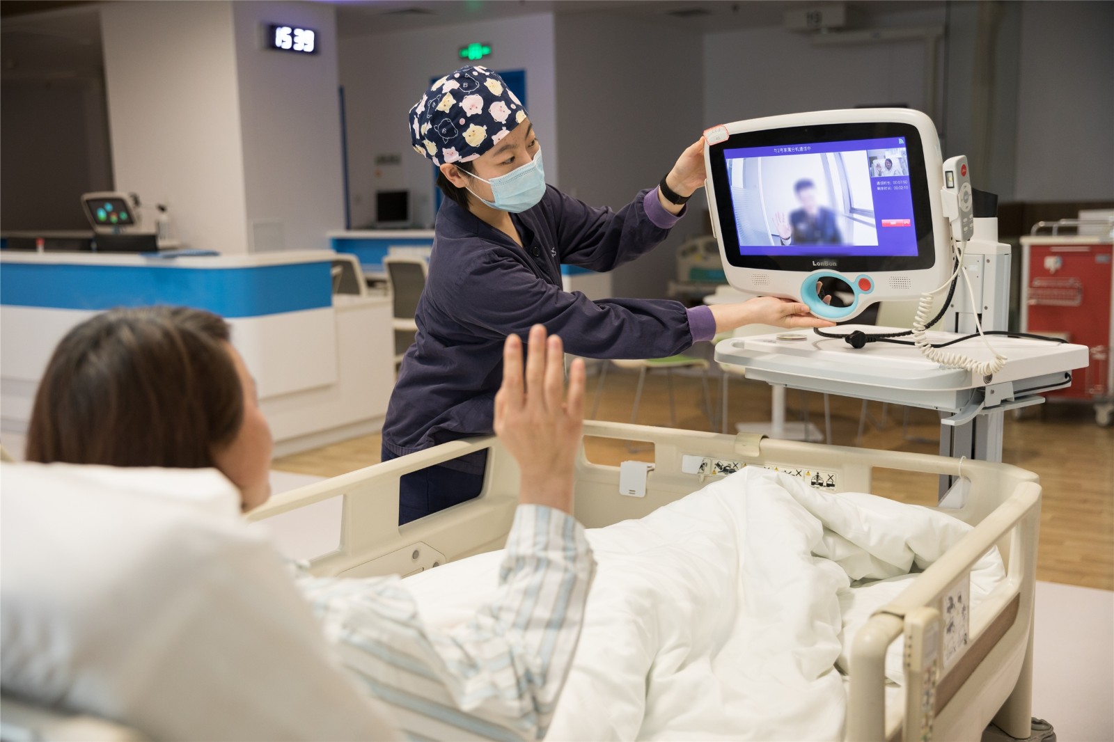 下午15点46分,厦门大学附属心血管病医院CCU护士张美玲通过远程探视设备让患者与家属便捷沟通,尽显人文关怀。刘云芳 供图