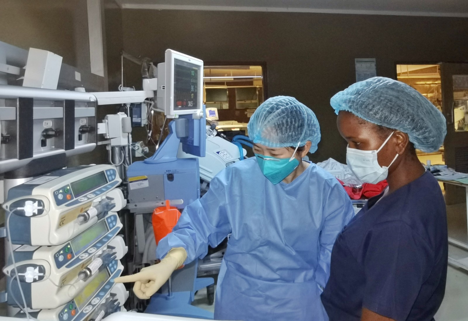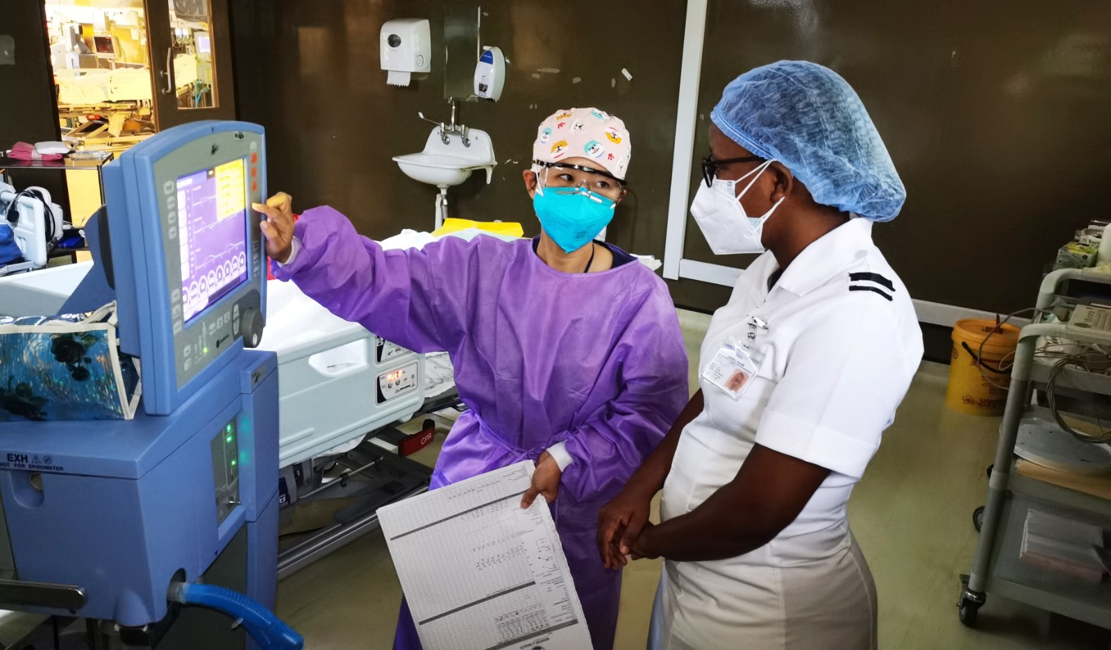 傍晚17点29分,在博茨瓦纳的公主玛丽娜医院重症监护室病房里,中国(福建)第16批援博茨瓦纳医疗队队员叶丽炜护士(左一)正在对当地实习护士进行护理操作教学,讲解呼吸机的各种参数及使用方法。