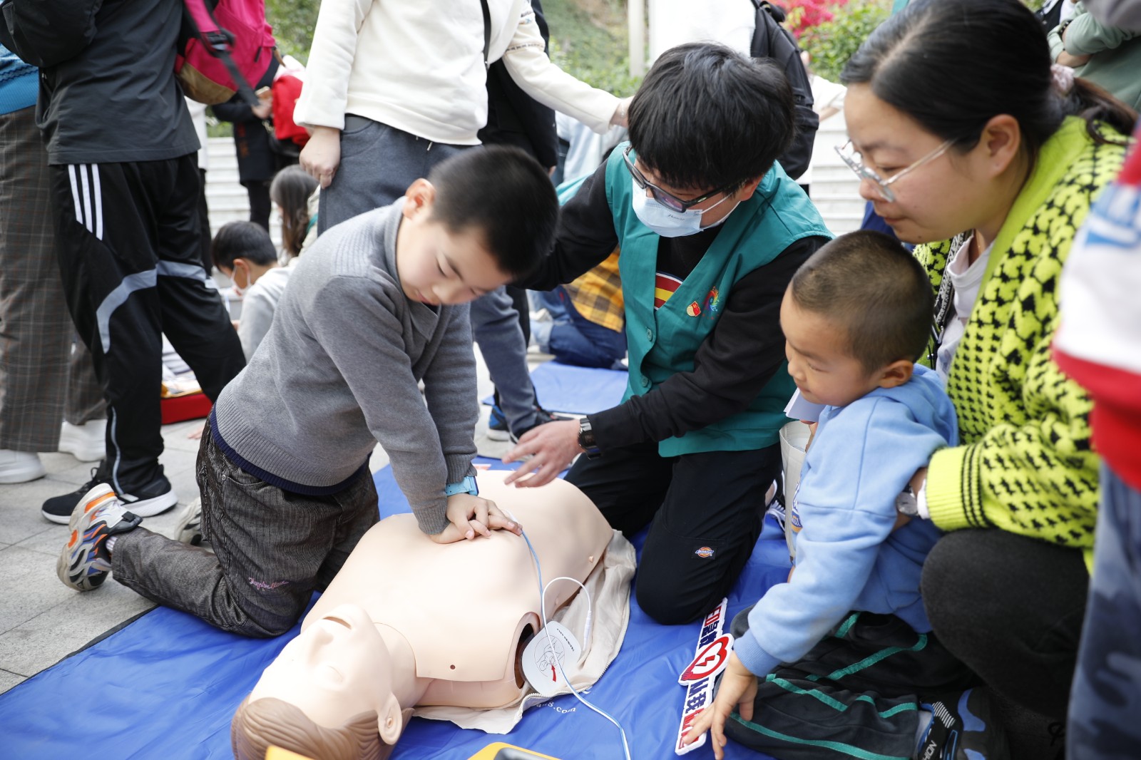 福建医科大学附属厦门弘爱医院重症监护室的护士张妮妮(右三)是一位青年志愿者,利用休息日到公园向群众科普教学心肺复苏技能。王玉供图