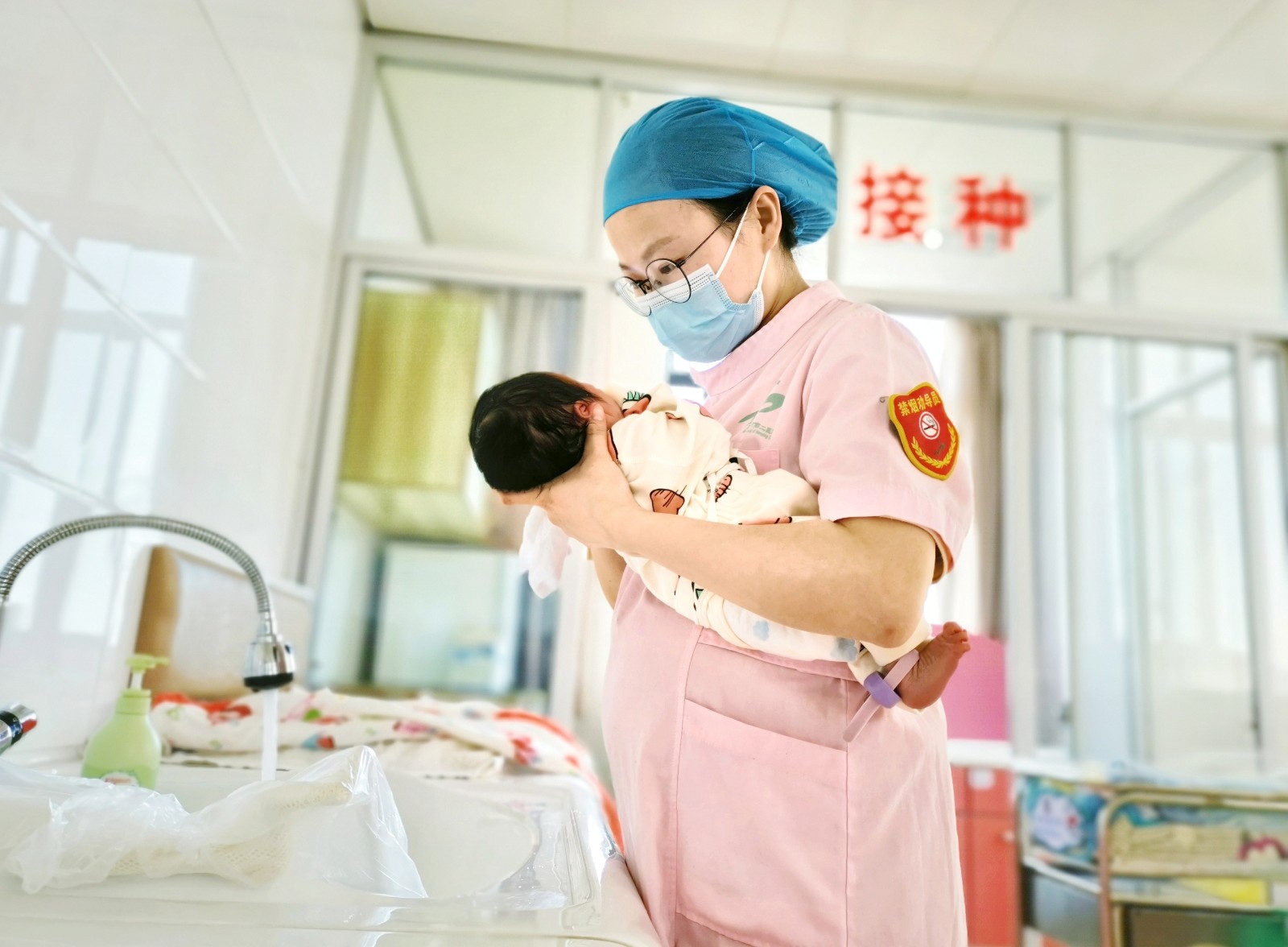 上午10点40分,已怀有七个多月身孕的福建省南平市第二医院产科护士范圆正在细心地为一名新生儿做清洁护理。郑艺姝 供图