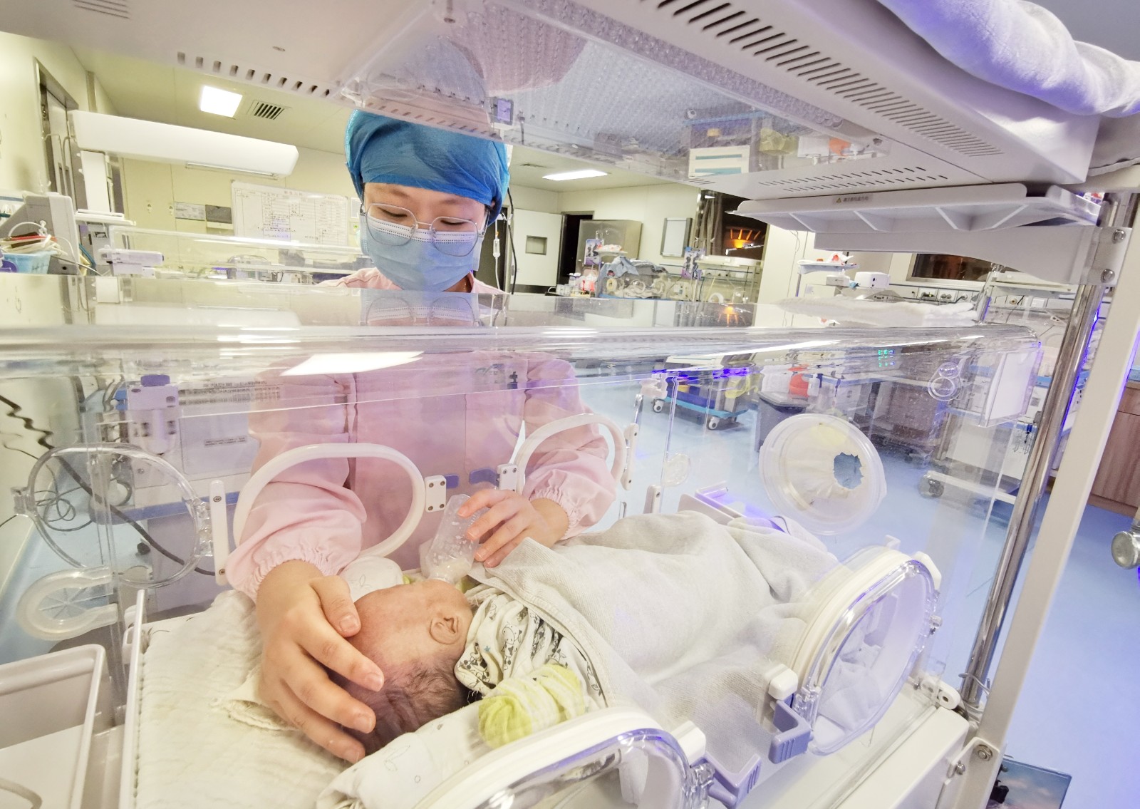 晚上22点14分,福建省南平市第二医院新生儿重症监护病房护士吴丽君一边安抚患儿情绪,一边给患儿喂奶。郑艺姝 供图
