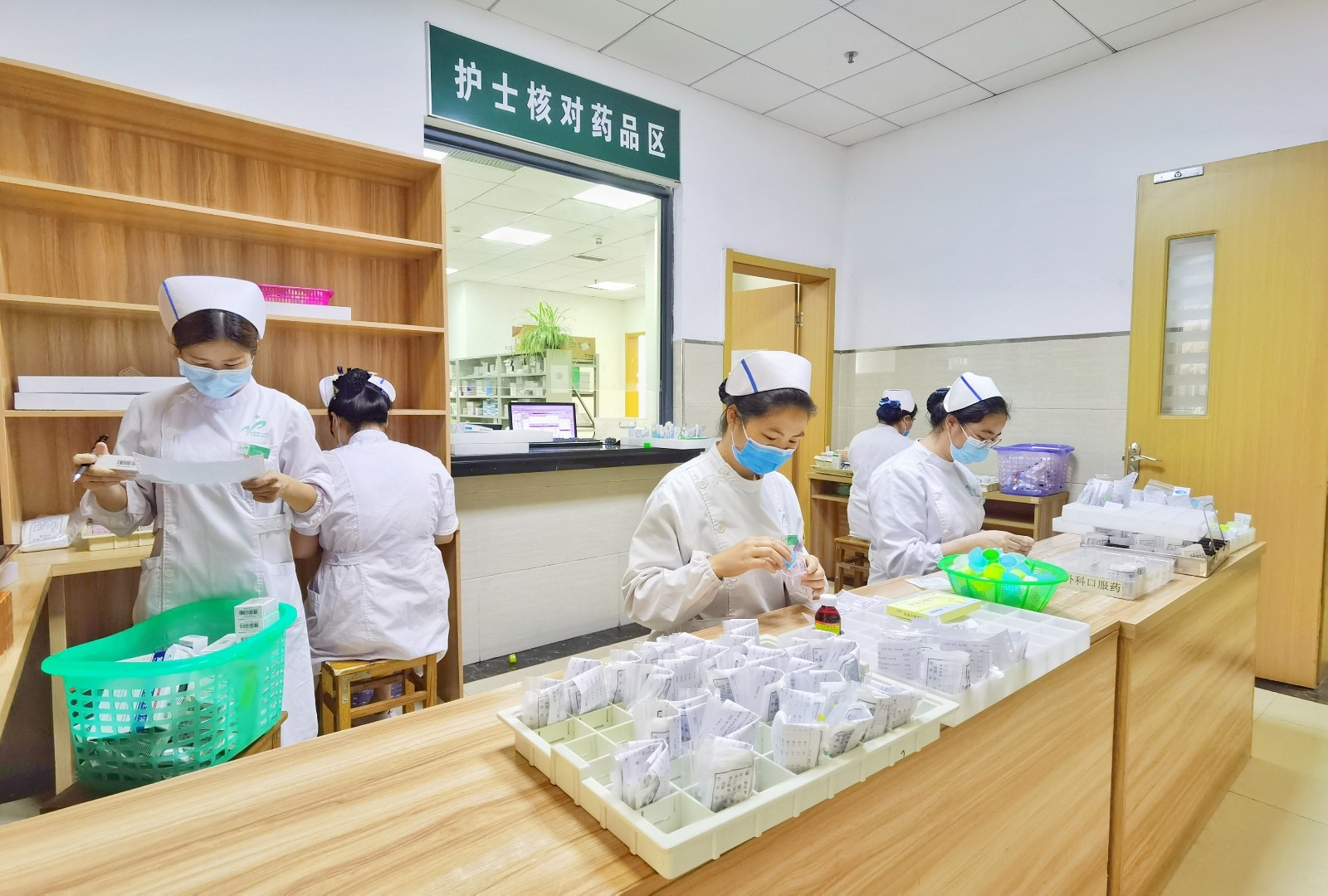 上午11点09分,福建省南平市第二医院的护士们在药房门口认真核对、分装药品。郑艺姝 供图