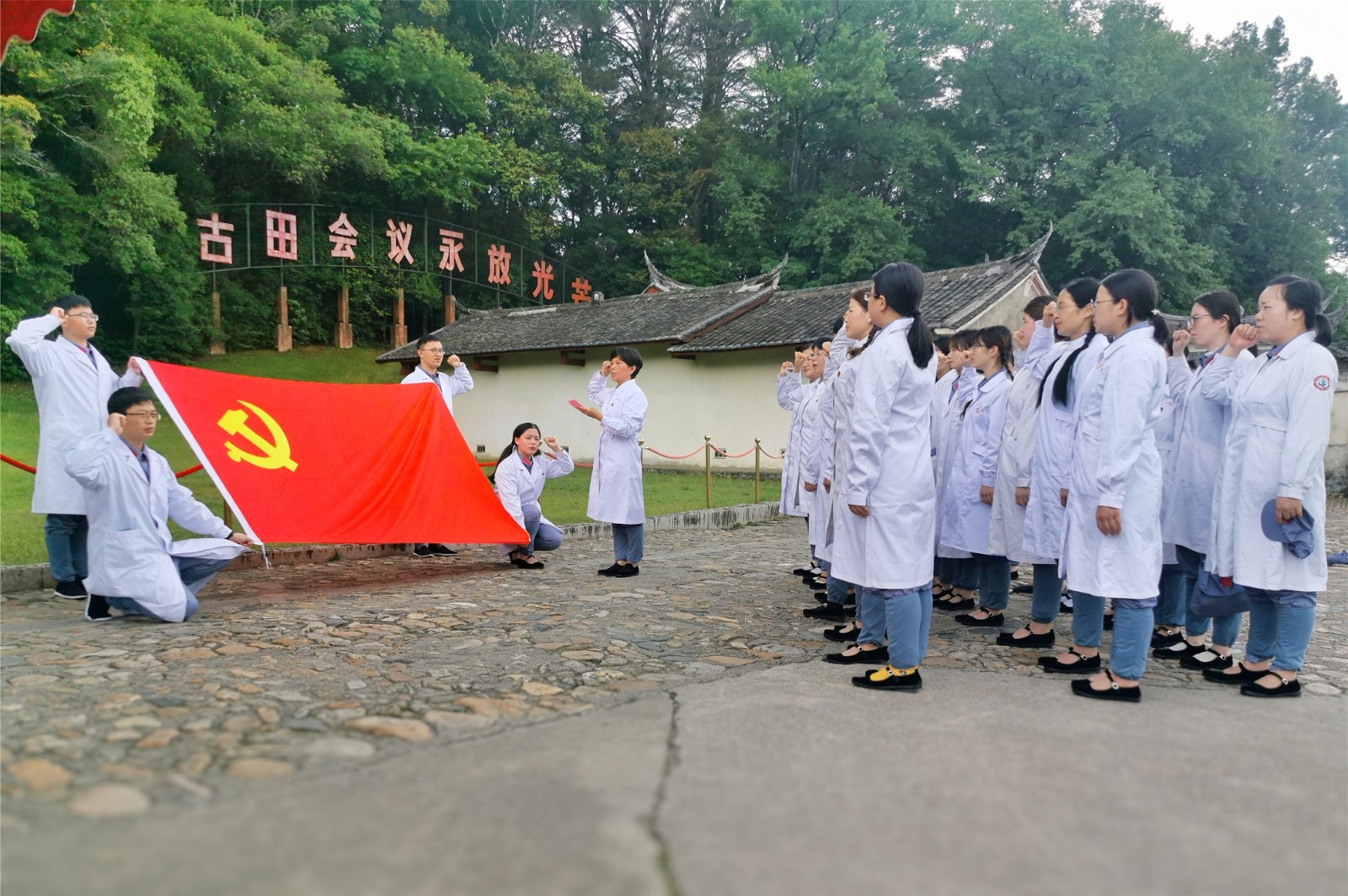 福建省龙岩市第一医院优秀党员护士代表在上杭县古田会议会址前重温入党誓词、唱红歌,响应今年我国护士节的主题“传承红色基因,创新发展护理”。严先蓝 供图