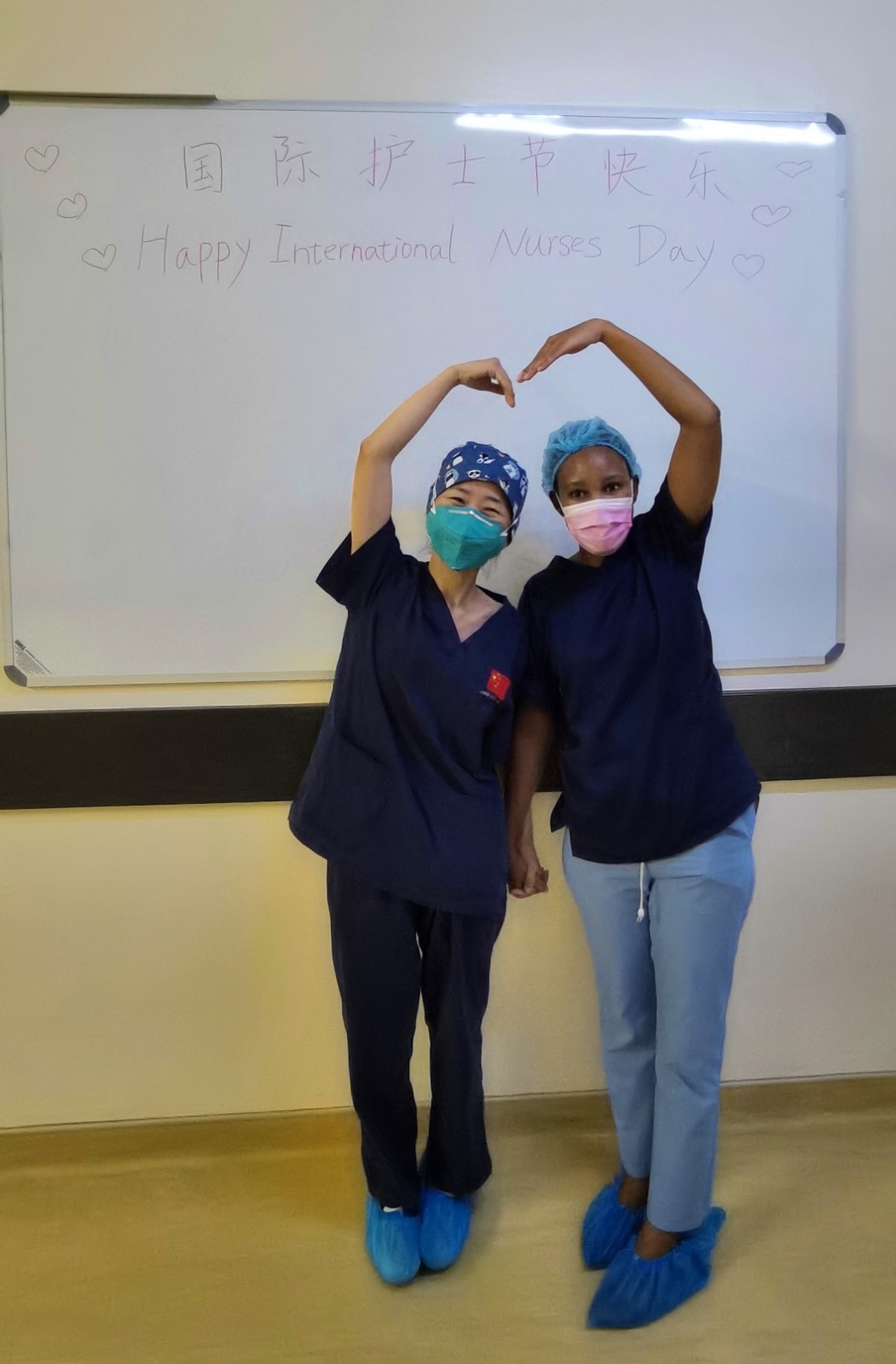 在博茨瓦纳的公主玛丽娜医院,中国(福建)第16批援博茨瓦纳医疗队队员叶丽炜护士(左一)与一起值班的该国护士互相致敬比心,开心共庆国际护士节 。
