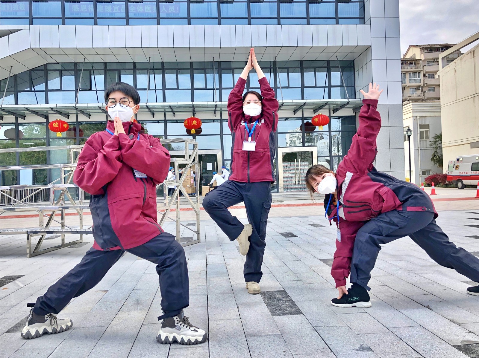 2020年3月,福建援鄂护士叶晓倩、黄津津、王苑华从湖北返闽前一天,在参与支援的宜昌市第三人民医院大楼前拍照留念。庆祝抗击新冠肺炎疫情取得重大胜利,为宜昌人民祈福、加油打气!