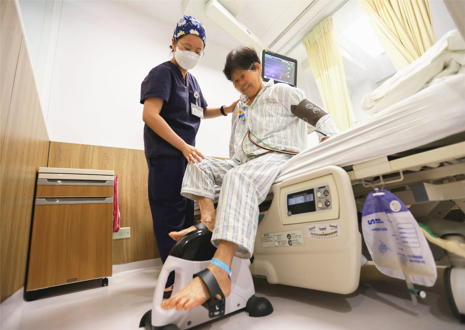 下午16点47分,厦门大学附属心血管病医院CCU护士卢慧琳帮助术后患者进行床旁康复训练。刘云芳 供图