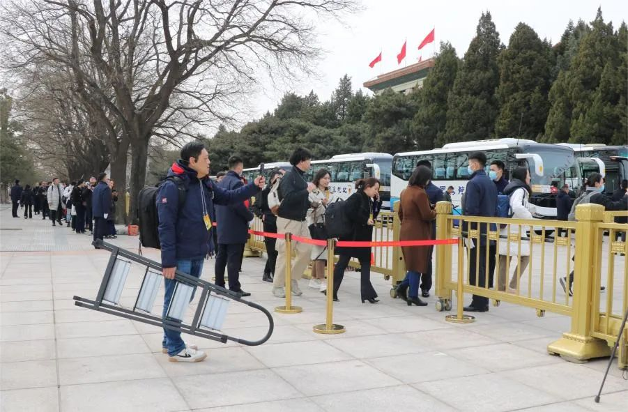 记者携带采访设备,准备进入人民大会堂。