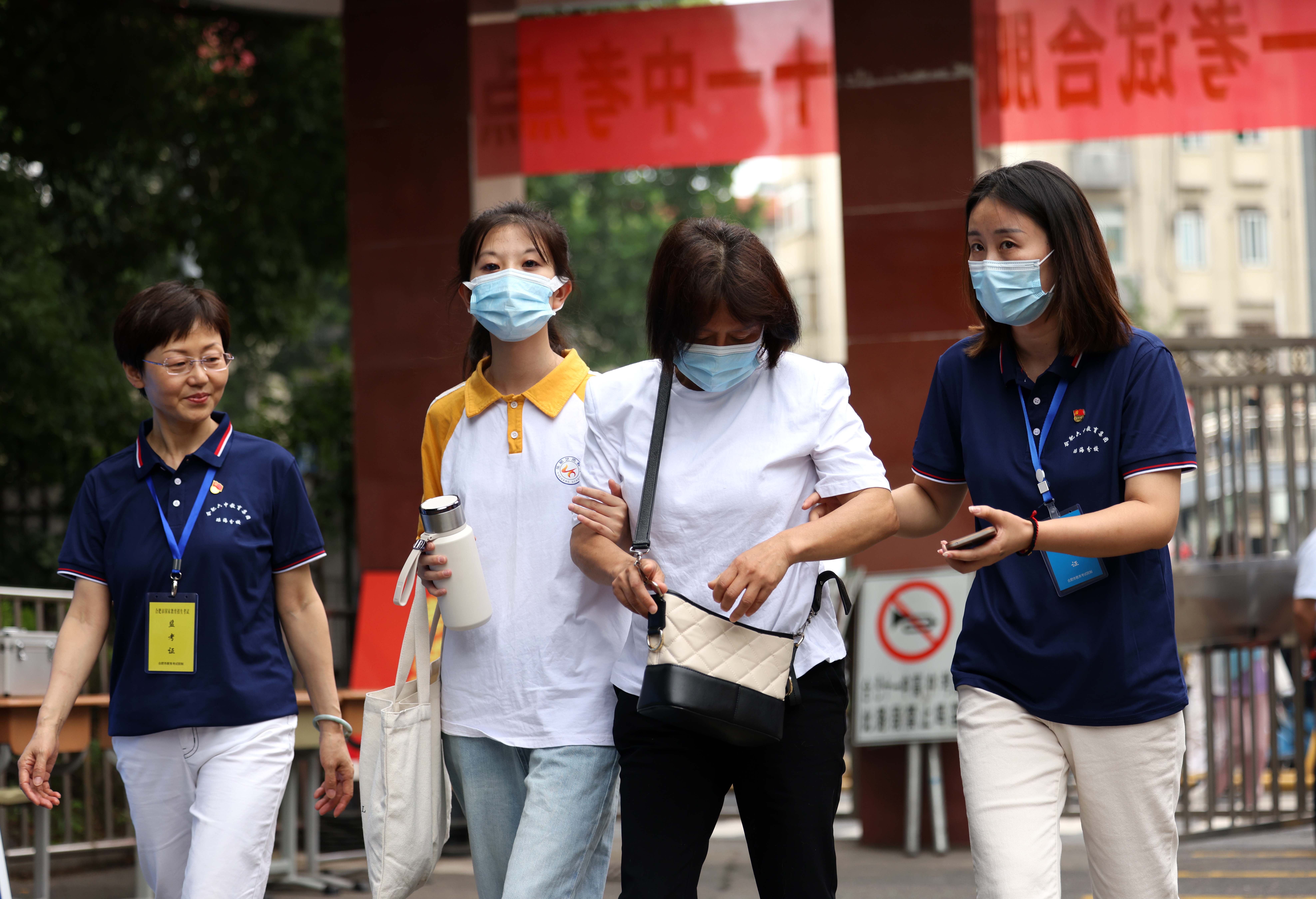 2023年6月7日,在安徽省合肥市第11中学高考考点,一名特殊考生在老师的服务下走进考场。