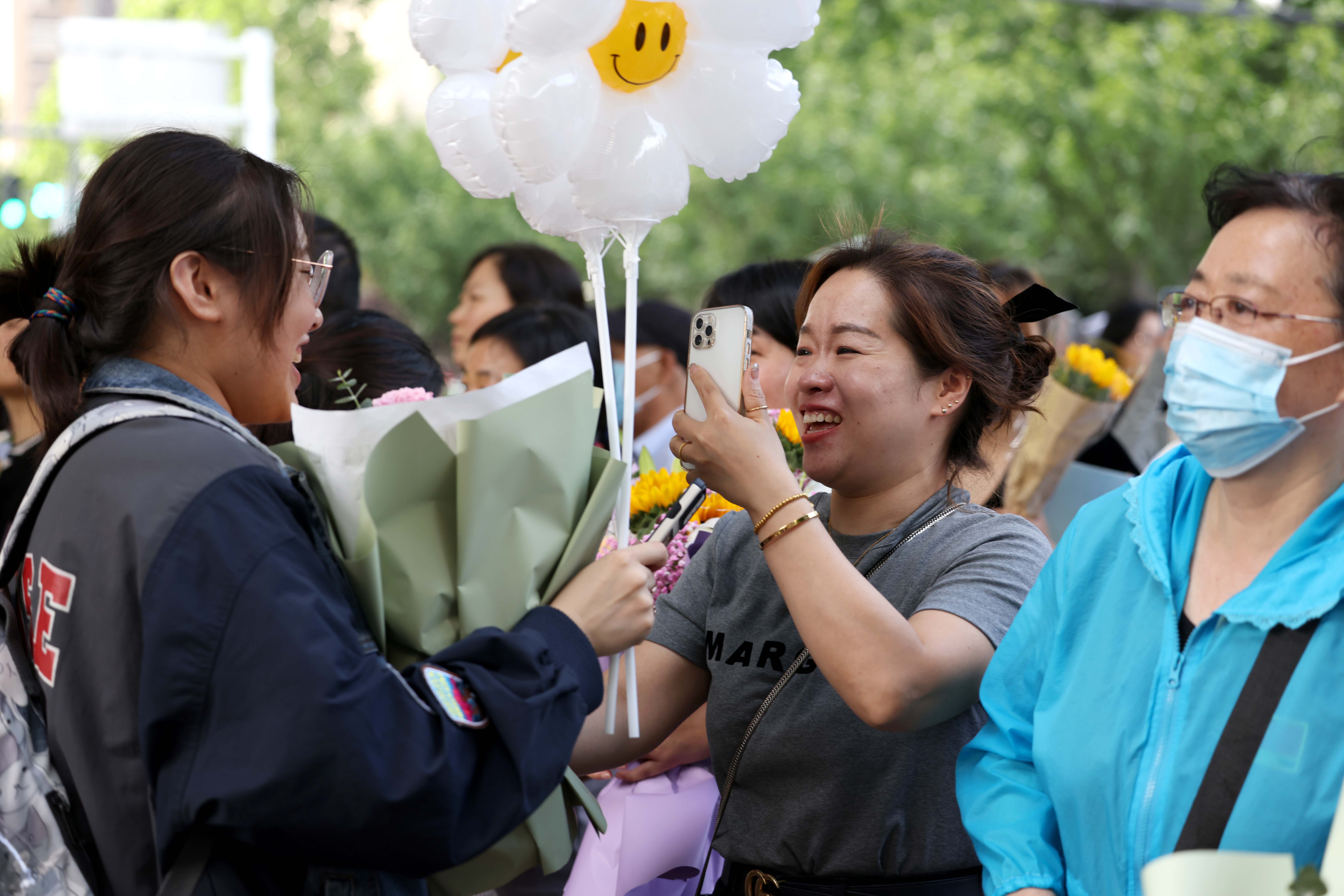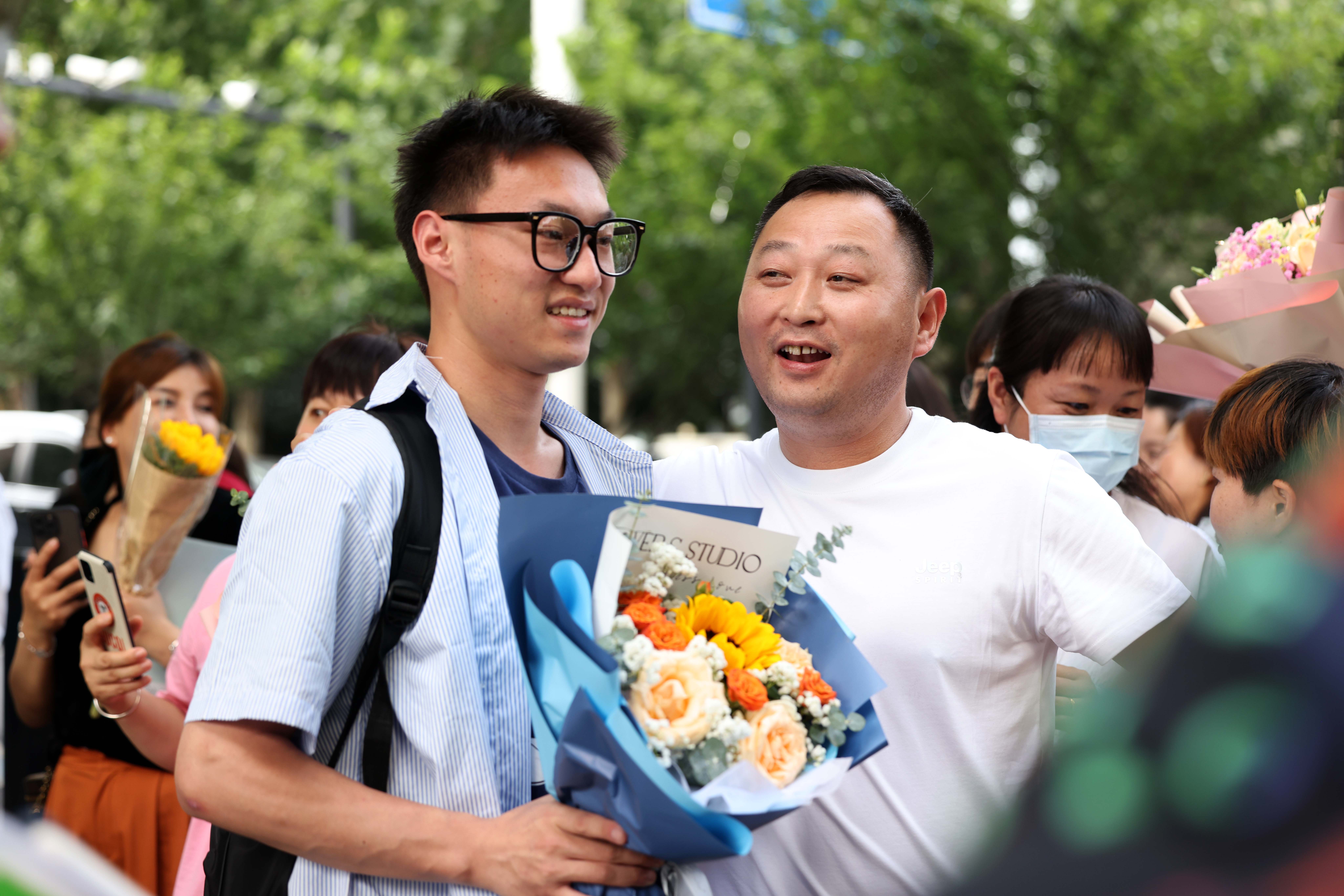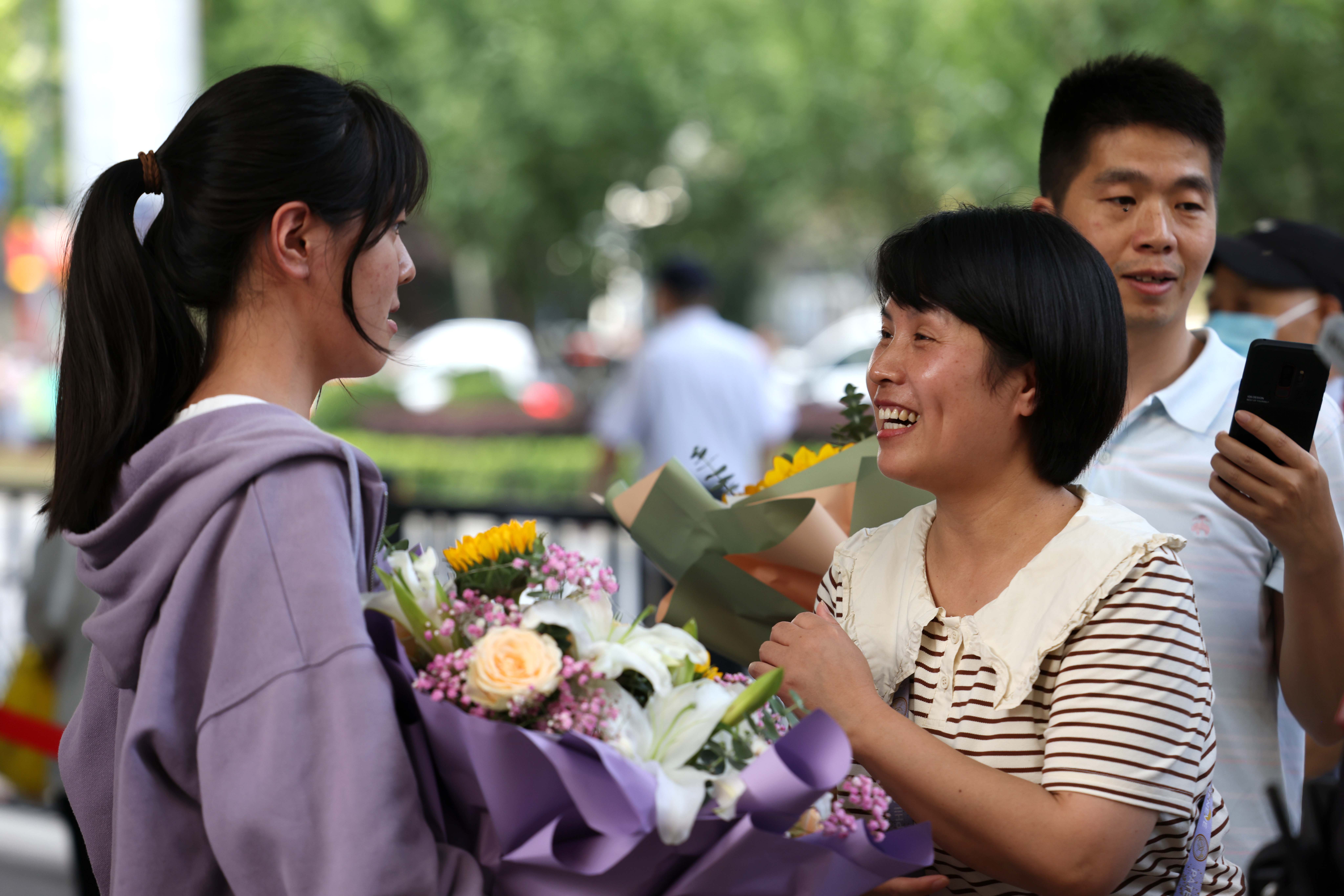 2023年6月8日,在安徽省合肥市第38中学高考考点,家长为考生送上鲜花和祝福。