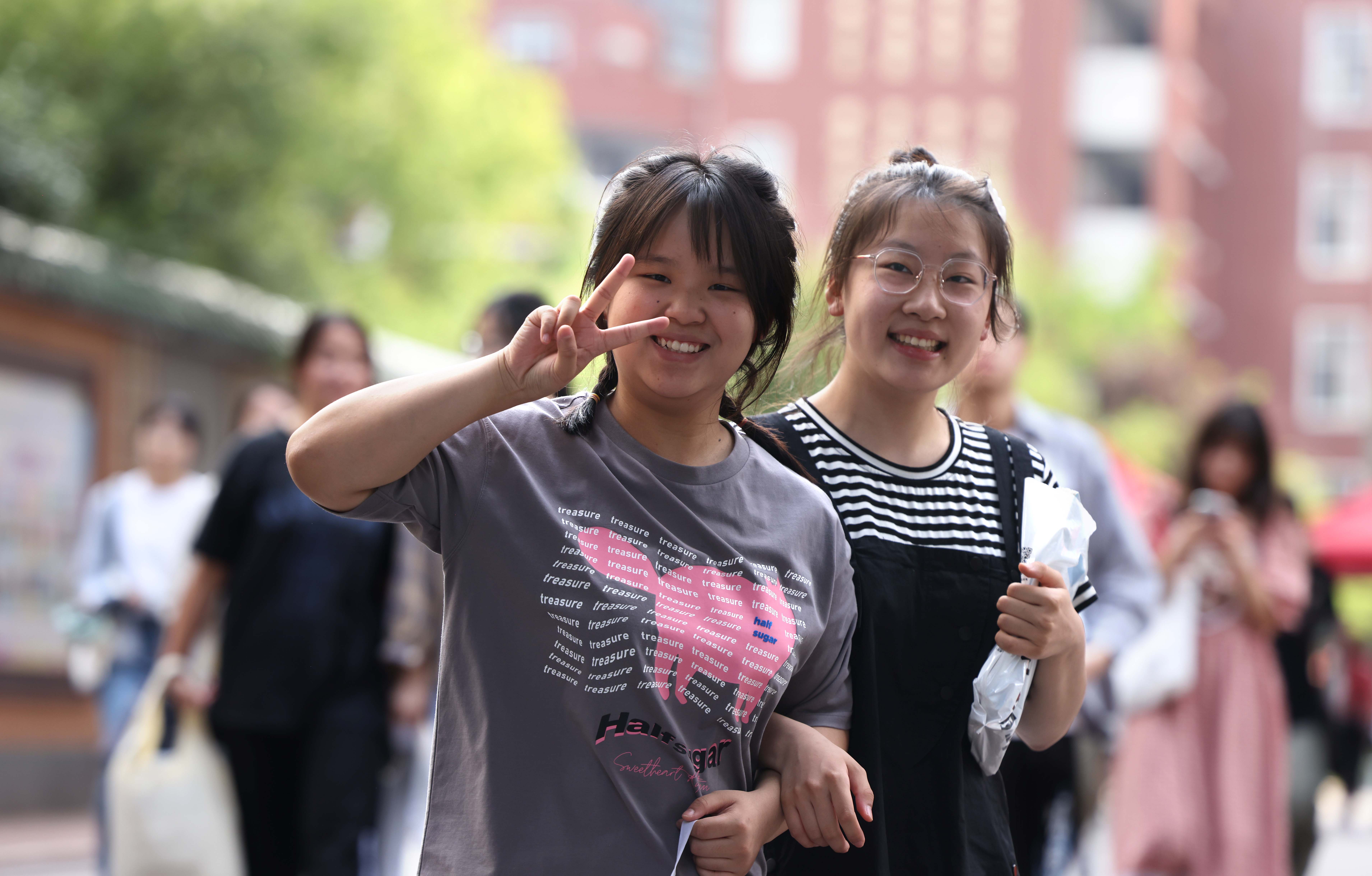 2023年6月8日,在安徽省合肥市第38中学高考考点,一对双胞胎考生在开心地合影留念。