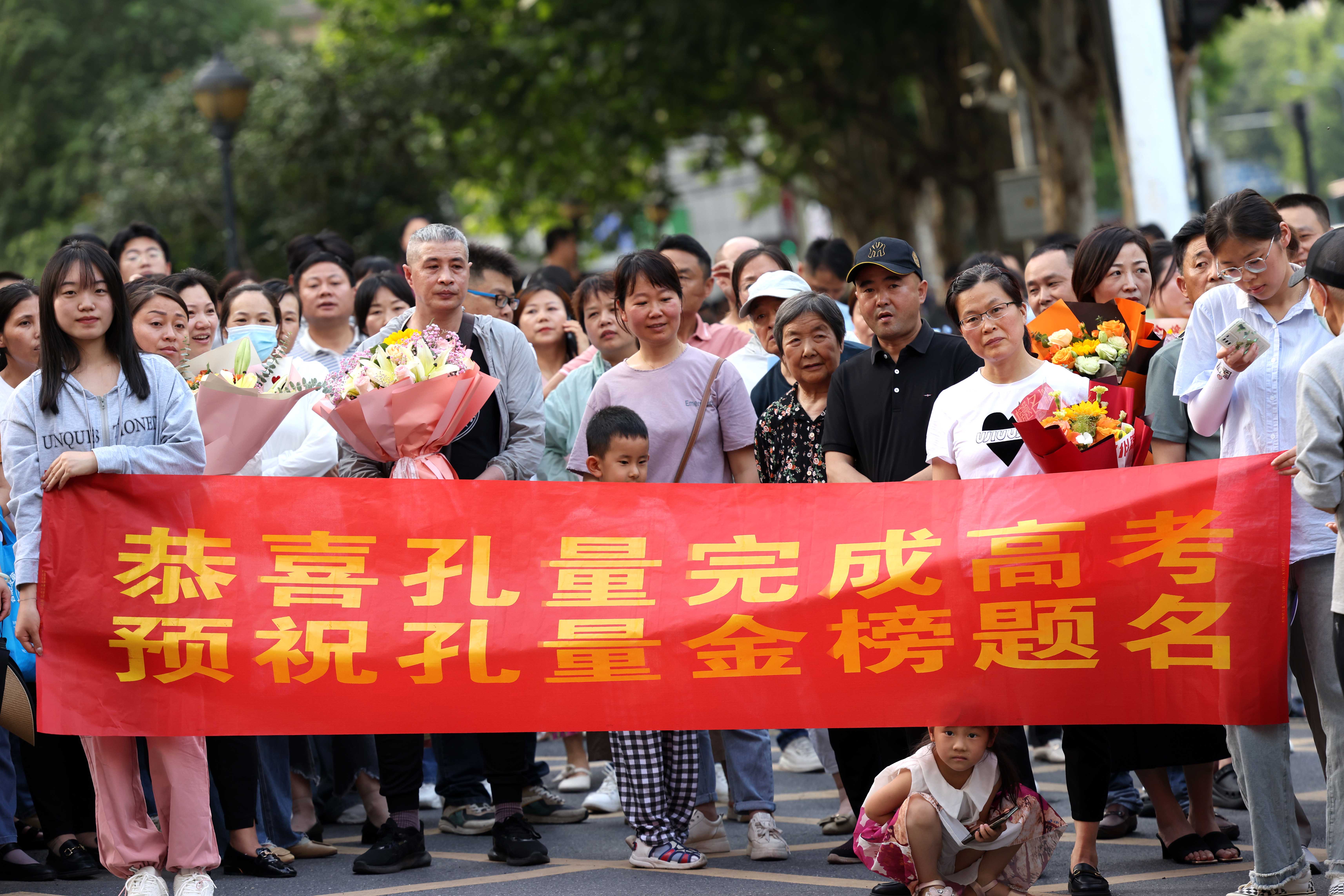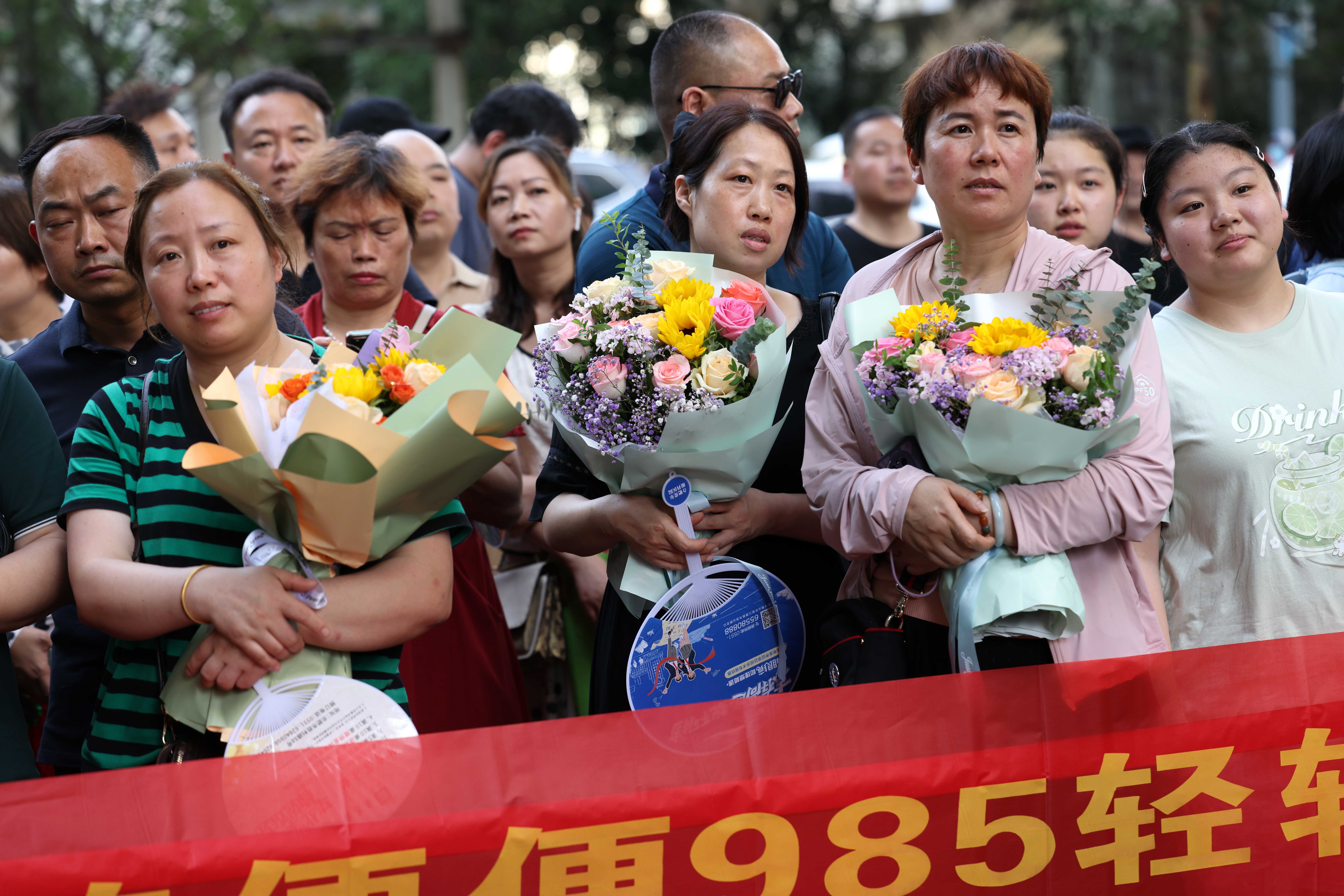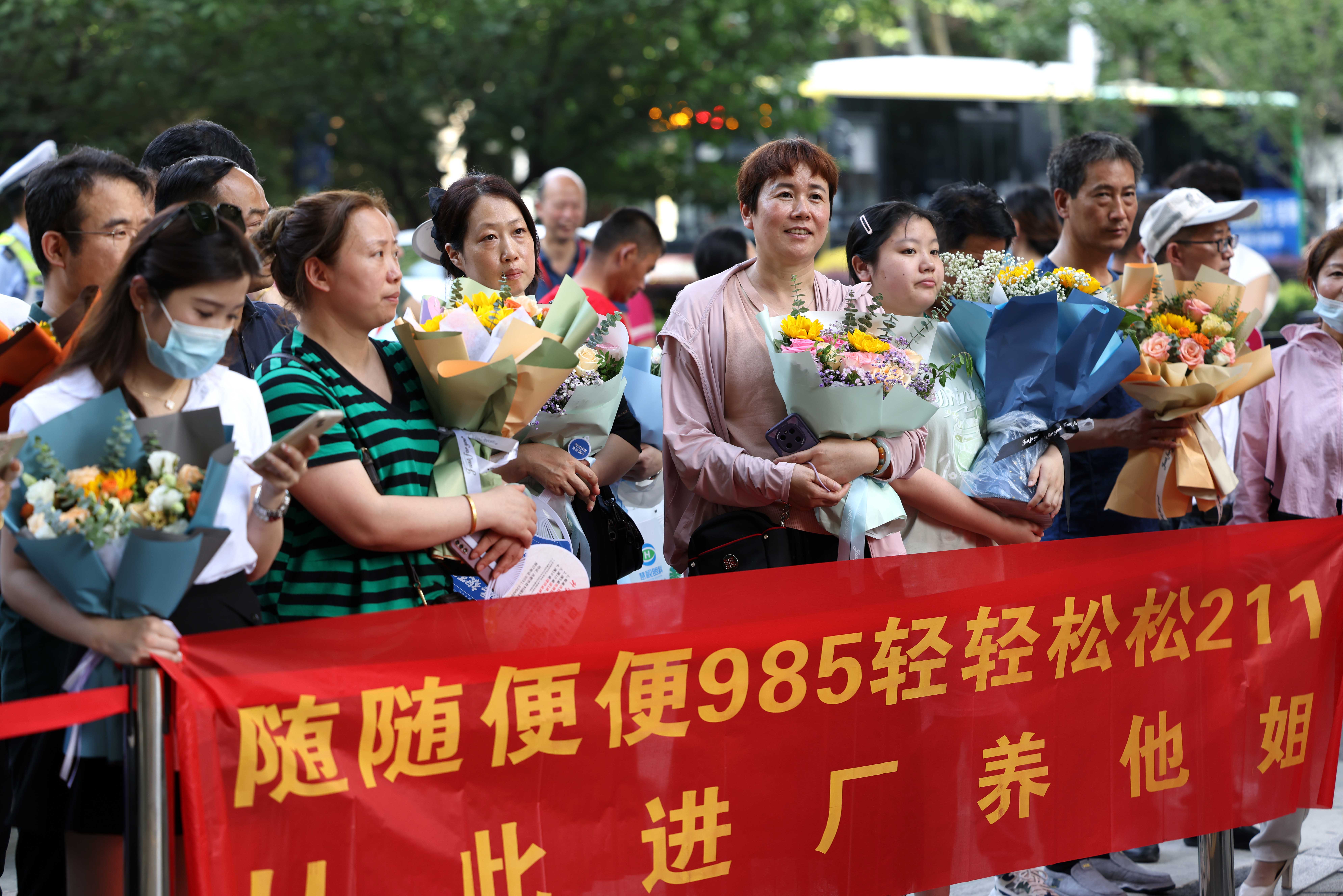 2023年6月8日,在安徽省合肥市第38中学高考考点,家长手持鲜花和祝福横幅在场外等候考生。