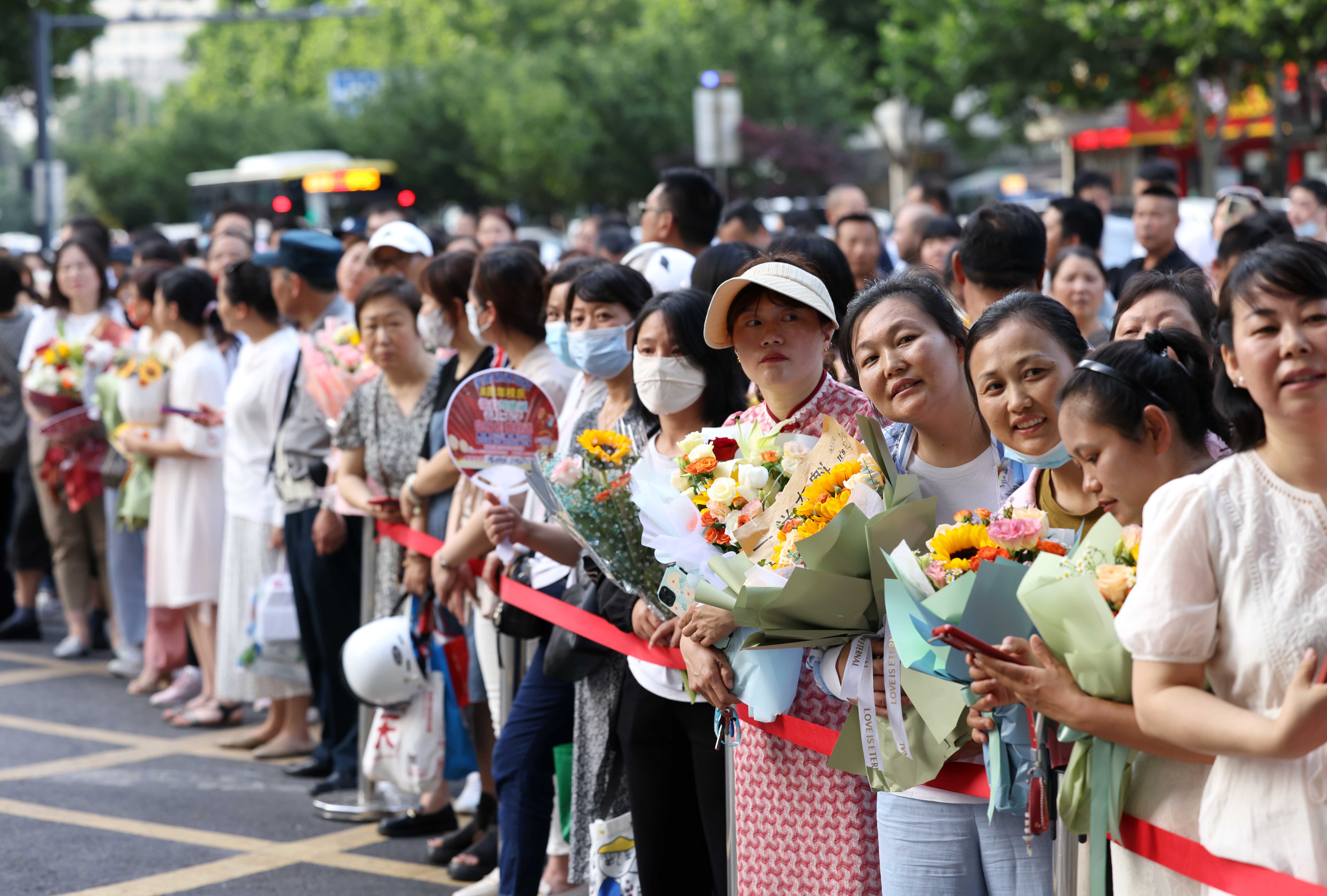 2023年6月8日,在安徽省合肥市第38中学高考考点,家长手捧鲜花在场外等候考生。