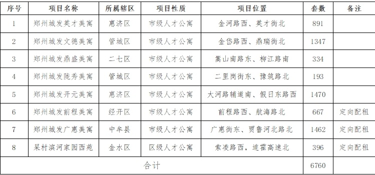 12月26日,郑州市住房保障和房地产管理局公布2023年郑州市第十批人才公寓配租方案,此次配租人才公寓项目8个,其中7个为郑州城发美寓系列人才公寓,共计6760套房源。