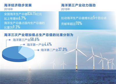 海洋经济新动能不断成长。据了解,海洋电力业、海洋生物医药业、海水利用业增加值同比分别增长12.8%、9.6%和7.9%。其中,重点监测的海洋生物医药企业主营业务收入保持较快增长,同比增长7.5%;海洋电力业发展势头良好,海上风电装机规模不断扩大,2018年新增装机容量达到180万千瓦,同比增长55.2%;海水利用业较快发展,《海水淡化产品水水质要求》等行业标准发布实施,我国企业中标哈萨克斯坦、印度尼西亚等国际海水淡化项目,产业标准化、国际化步伐逐步加快。