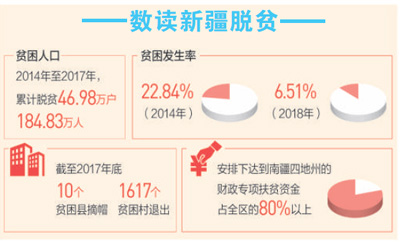 党的十八大以来,新疆维吾尔自治区认真贯彻落实习近平总书记关于扶贫工作的重要论述,把打好精准脱贫攻坚战作为推动党中央治疆方略落地生根、实现新疆社会稳定和长治久安总目标的关键举措,走出了一条具有新疆特色的脱贫攻坚之路。确定南疆四地州22个深度贫困县及所辖192个深度贫困乡镇、1962个深度贫困村和162.75万贫困人口,将其作为脱贫攻坚的重中之重、坚中之坚。大力实施特色产业带动、转移就业、易地扶贫搬迁、突破瓶颈制约等8个专项行动;围绕新疆社会稳定和长治久安,实施边境扶贫、基层基础建设两个专项行动。发挥贫困群众主体作用,常态化开展感恩教育、民族团结联谊等活动,深入推进“去极端化”教育,破除“等靠要”思想。