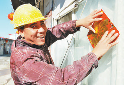 大年三十,在中老铁路安定隧道建设工地,工人正在贴“福”字。