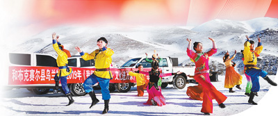 大年三十,新疆和布克赛尔蒙古自治县“红色文艺轻骑兵”乌兰牧骑演员正在表演。
