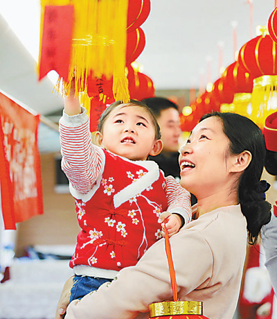 高铁列车上,旅客在欣赏灯笼。