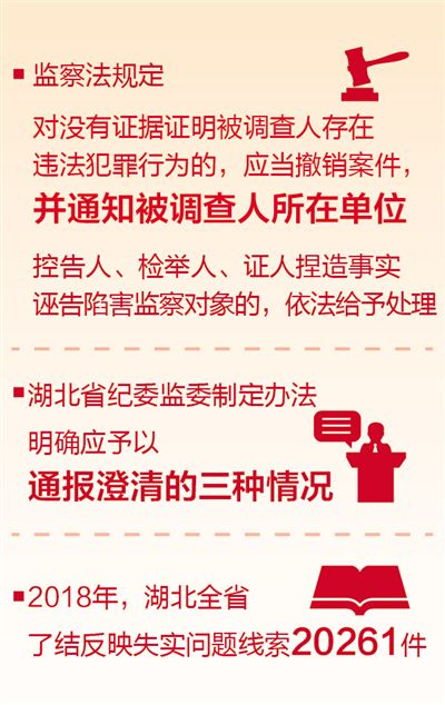 据了解,湖北多地出台了反馈、了结不实举报的制度。恩施州来凤县要求对不实举报的调查处理结果,通过信访反馈见面会、院落会议等形式,在一定范围内通报澄清;十堰通过召开澄清会、出具书面说明、在民主生活会上对约谈函询的问题进行说明等方式,消除负面影响;天门建立了匿名重复信访举报公开反馈、公开复查制度……去年,全省纪检监察机关了结反映失实问题线索20261件。