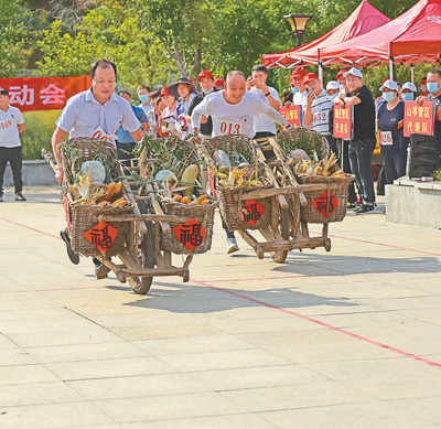 山东省枣庄市山亭区山城街道灵芝湖社区,村民参加农民运动会“运粮”项目比赛。