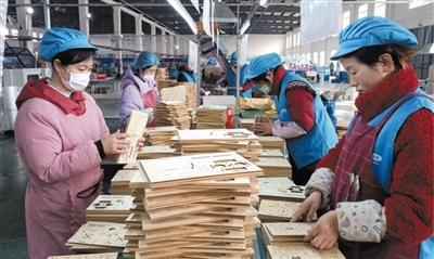 在江苏机器时代文化创意有限公司,工人们正组装木质工艺品、木质拼接玩具等定制产品。