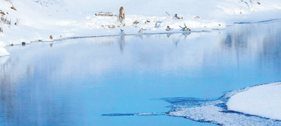 在冬日,呼玛河流域多处出现冰包、雪包,以及冰瀑、冰幔,这就是温泉存在的标志。温泉是不冻河段形成的主要原因,一般来说,在较大温泉或温泉群的下游会出现不冻河。而在河道中,较大温泉或温泉群是间断性出现的,所以一般冰封河和不冻河也会间断出现。
