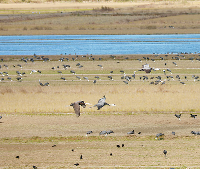 每年10月进入越冬期,当地鹤类保护委员会都会从保护区内的农户手中有偿租借100余公顷农田,围上网状栅栏,设置为鹤群免受打扰的核心区域;这里的居民在鹤群到来后,外出和回家时要走“迂回路线”避开核心区域;清晨,保育员会在核心区域内铺撒小麦等饵料,保障鹤类的食物来源。临近鹤类北归时,投喂的饵料中还会用小鱼“加餐”,增加能量储备。