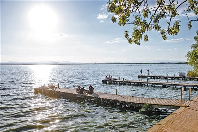 游客在瓦伦西亚阿布菲拉湿地公园内的湖边观光休憩。