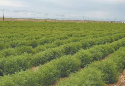 新疆克拉玛依农业综合开发区,种上盐地碱蓬的一片盐碱地披上绿装。韩毅摄