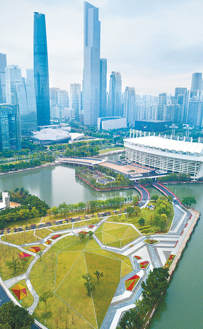3月29日拍摄的广州二沙岛,这里四季绿草茵茵,花团锦簇,绿道四通八达。