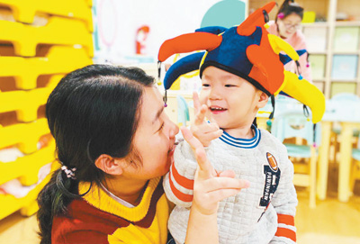 在青海省西宁市某早教中心内,一些学龄前儿童在家长陪护下接受早教训练。该早教中心针对0到5岁儿童开展育乐、音乐、艺术、生活技能、学校技能等训练。人民视觉
