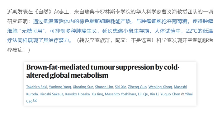 Nature最新研究表示:温度调低,可抑制多种癌症生长!并有网友总结该研究结论为:科学家发现开空调能够治疗癌症。