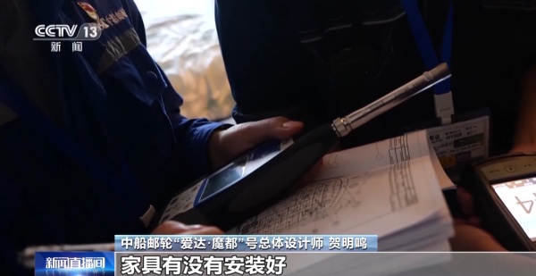中船邮轮“爱达·魔都”号总体设计师 贺明鸣:我们在测试之前,首先要检查地毯有没有铺,家具有没有安装好,要完全模拟正常运营的情况。乘客房间的要求一般是49分贝,经过现场测试,房间的分贝数是42.9分贝,这个是完全低于标准的,就像在自己舒适的家中一样。