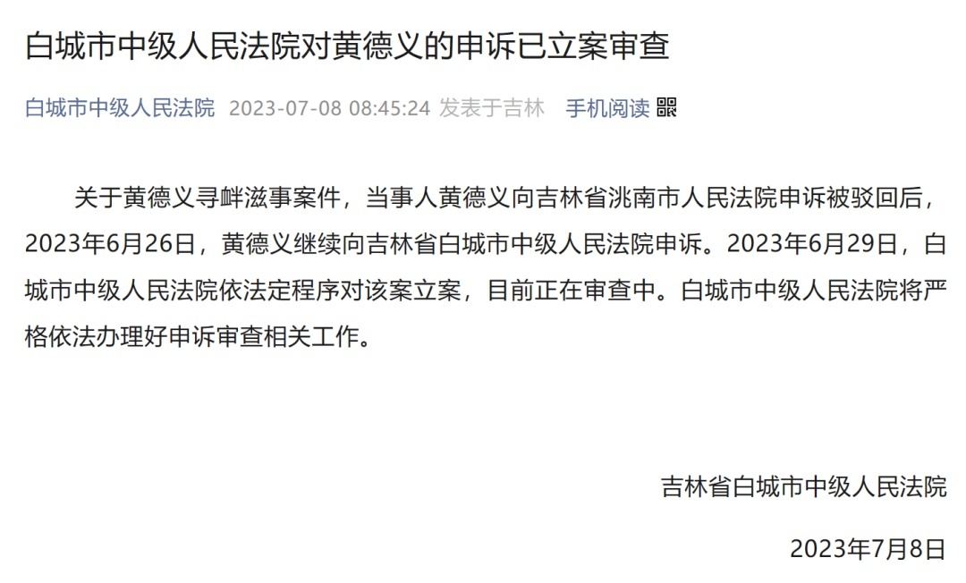 据吉林省白城市中级人民法院7月8日消息,关于黄德义寻衅滋事案件,当事人黄德义向吉林省洮南市人民法院申诉被驳回后,2023年6月26日,黄德义继续向吉林省白城市中级人民法院申诉。2023年6月29日,白城市中级人民法院依法定程序对该案立案,目前正在审查中。白城市中级人民法院将严格依法办理好申诉审查相关工作。