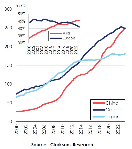 21世纪初,日本是按总吨位计的最大船东国,随后希腊在2013年超过了日本排名第一。随后2018年中国也超过了日本,开始了对希腊的“追击”。