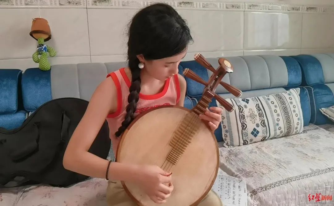 金枝利用暑假学习月琴弹奏