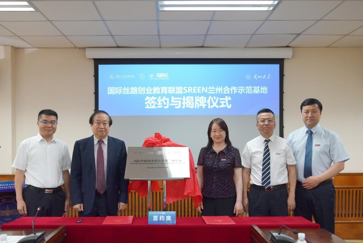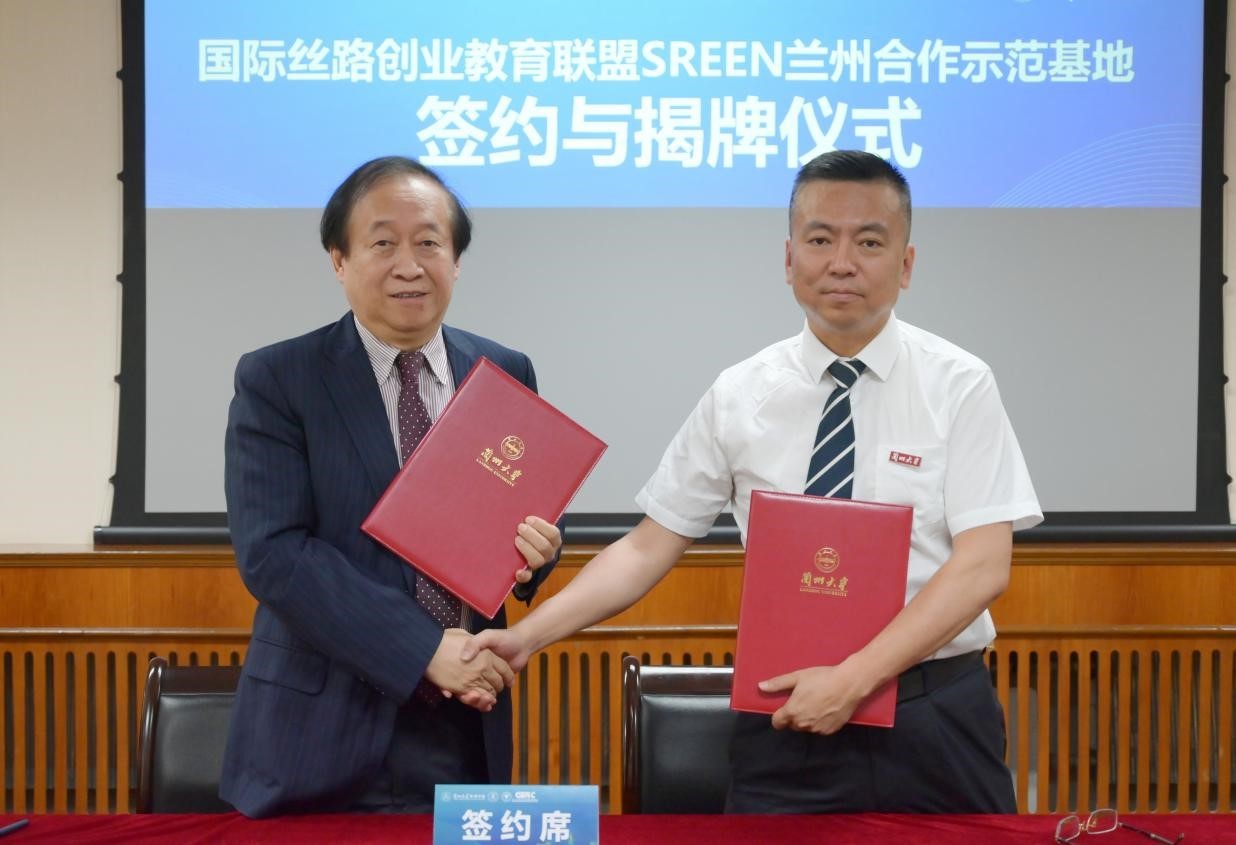 签约揭牌环节,王重鸣与兰州大学管理学院院长何文盛共同签署共建国际丝路创业教育联盟兰州示范基地协议。在全体参会代表见证下,勾晓华与王重鸣一同为兰州基地揭牌。