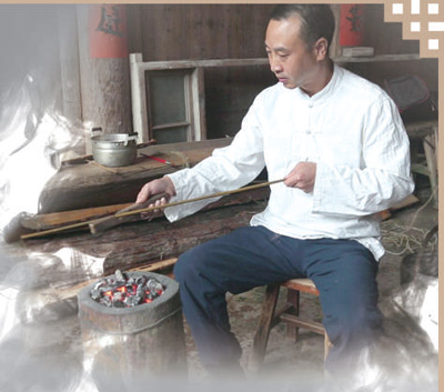 制弓时,先将竹子置于炭火上进行炭化,破成一寸宽的竹片后整直,再细细刨去竹黄,留下强韧的竹青层作为弓体。“弓体由两张竹片黏合而成,刨制时必须处理好两者的张力。”为此,张召羽要根据竹片的特性反复调试其性能状态。此后,刮花竹黄面,用调制好的鱼鳔胶涂在竹木片刮花的一面,黏合竹片,并缠上走绳加固定型,再经过修整弓弰、打磨弓弝、涂漆、上弦等工序,最终完成弓的制作。