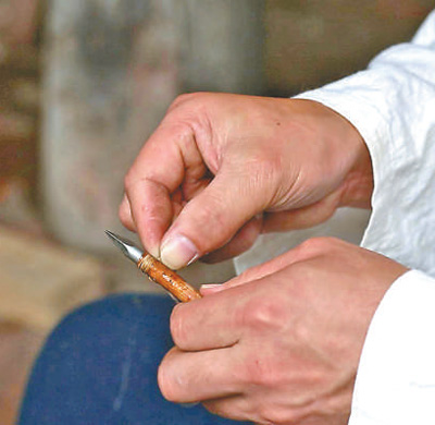竹箭的箭杆采用3年至5年生、直径8至10毫米的箬竹,切成竹段后进行校直。“每一根竹子的弯曲性状都不同,因此每一支竹箭都需要工匠反复手工校直。”张召羽说,在竹箭制作中,最难的就是校直。校直时,工匠在炉火上烤制竹段,徒手感知烘烤时竹段的软化程度。若烘烤不到位,捋直的箭会自动回弹影响精度;若烘烤过度,竹段会过度炭化导致韧性全无,箭一掰就断,难以使用。一支箭,要经过五六遍的反复校直,才能保证箭杆的直度符合射箭需求。