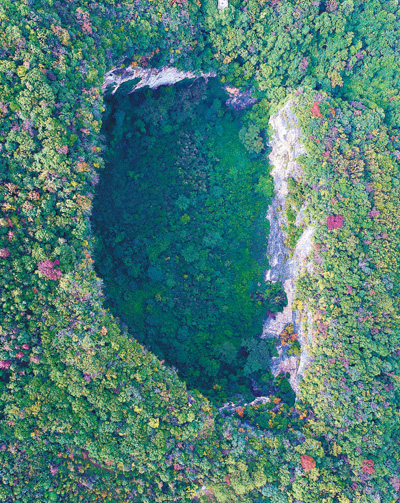 在黔桂交界处的广西乐业县,当地群众称为“大石围”的天坑群内部,生长着茂密的植物。
