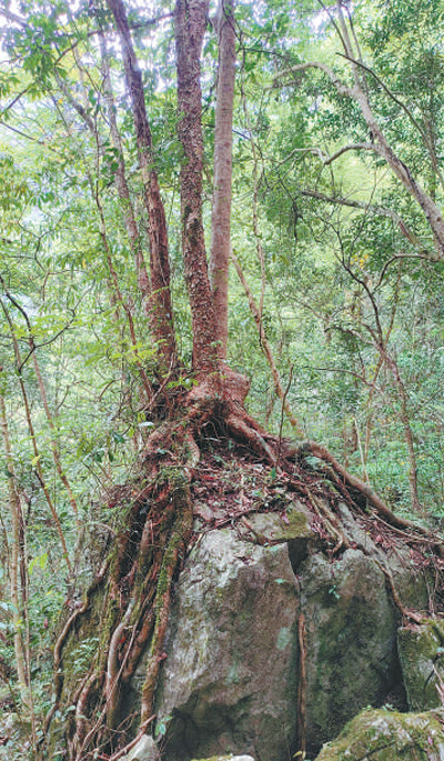 “这些只有我们胳膊粗细的树木,实际上至少有一二百年树龄。”乐业县户外运动管理中心副主任禤琼飞停下了脚步,让记者观察在石头上扎根的一丛树——这块顶部不大的石灰岩上,生长着4棵国家重点保护野生植物,其中2棵为我国特有的国家一级重点保护野生植物掌叶木,另外2棵是国家二级重点保护野生植物香木莲。