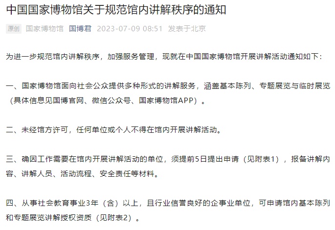 为进一步规范馆内讲解秩序,加强服务管理,现就在中国国家博物馆开展讲解活动通知如下: