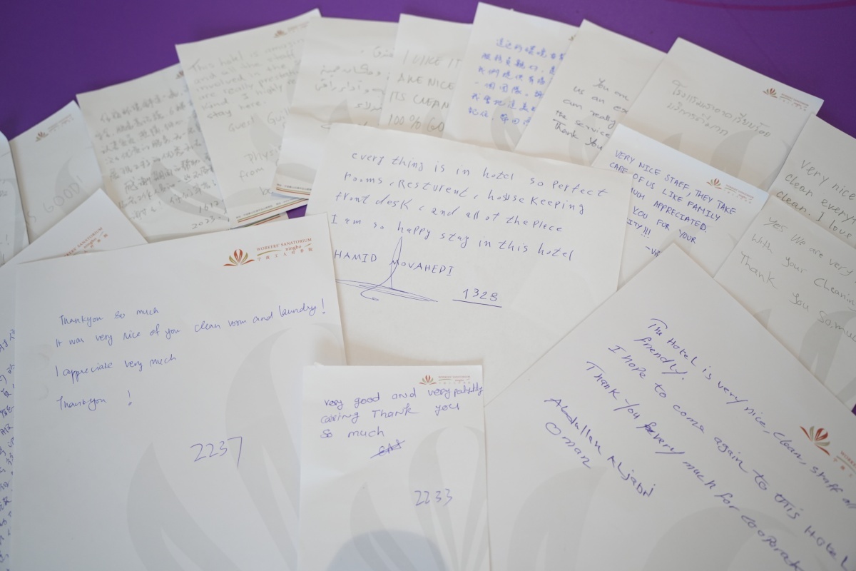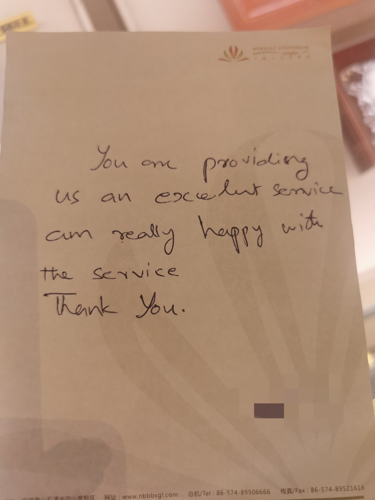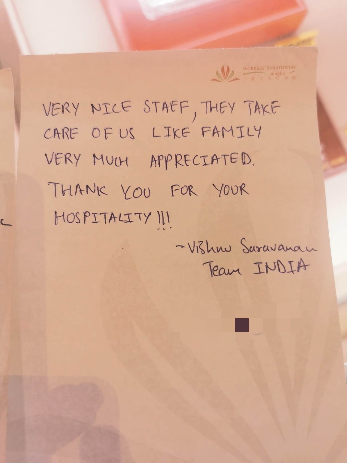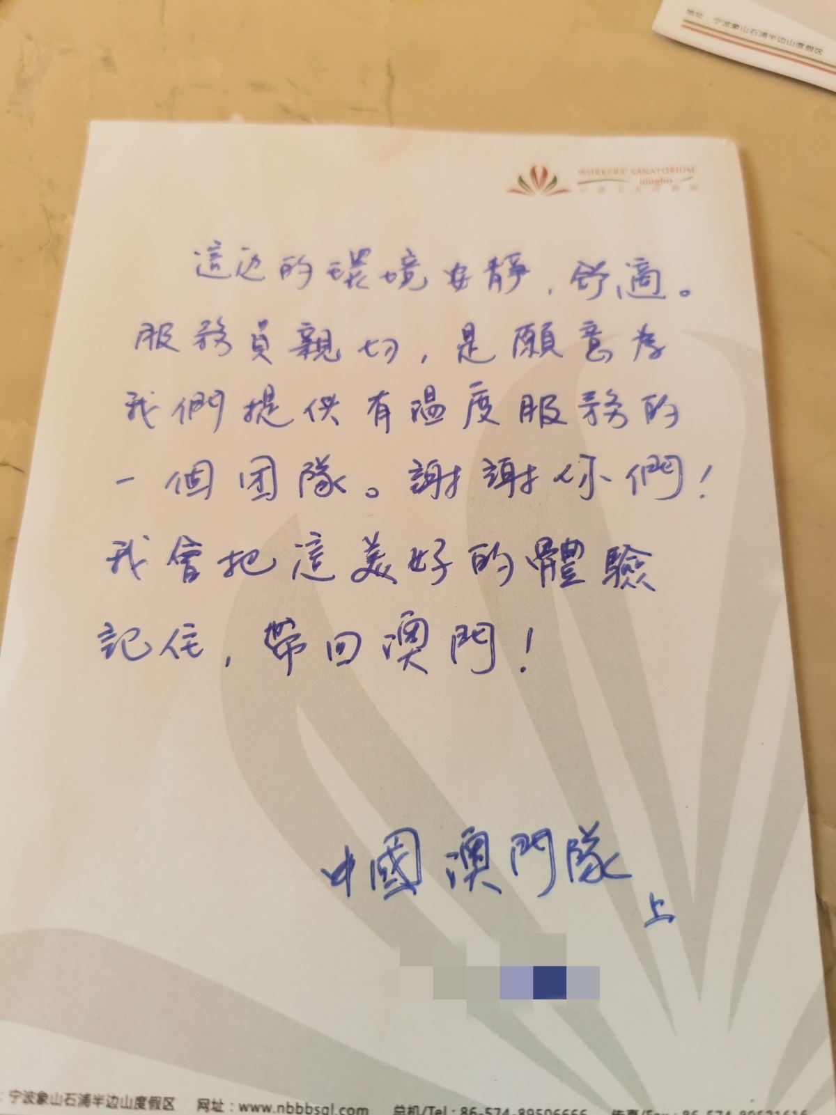 9月21日早上,记者联系到了宁波亚运分村运动员分村房务部工作人员黄敏华,她回忆道,20日打扫房间时,自己收到了一份特别的“礼物”——一封简短但十分温馨的感谢信:“所有人都很友善,并且乐于助人,特别感谢黄敏华女士。”落款是:Macao Team。