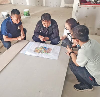 刘振兴(左一)在策勒县天津工业园区津和数字电子展馆施工现场办公。